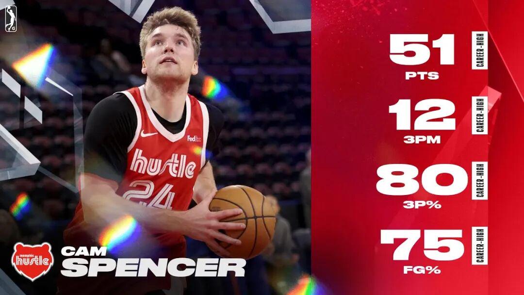 每年发展联盟会在固定的场地进行“展示杯赛”,全联盟的球探都会来考察,而在这三场比赛里,斯宾塞场均得到28.7分、投篮命中率60.8%,三分命中率56.3%,罚球命中率100%。还包括一场单场投进12个三分,轰下51分的神级表现。