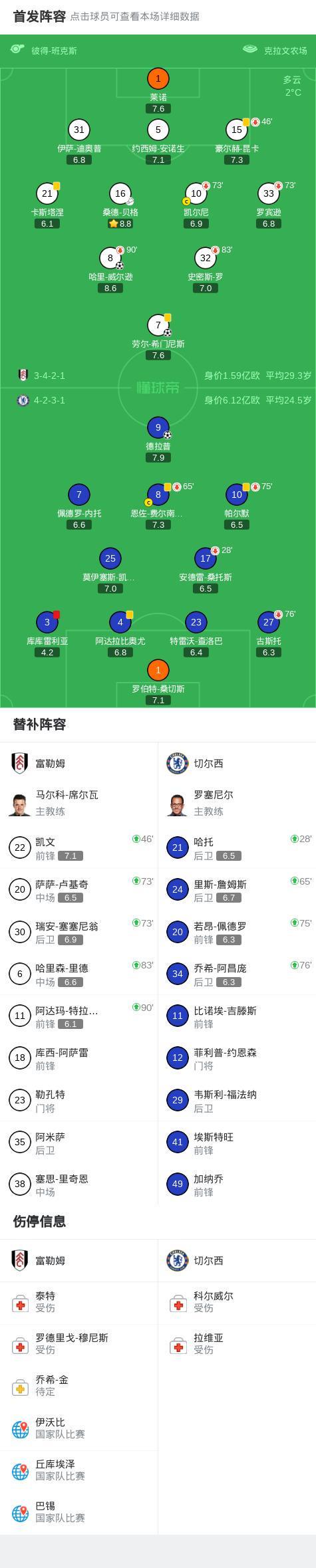 北京时间1月8日英格兰足球顶级联赛 联赛 第21轮,富勒姆主场对阵切尔西。上半场库库雷利亚背后拉人破坏单刀机会,裁判直红将其罚下,劳尔-希门尼斯越位在先,哈里-威尔逊进球被吹无效。下半场桑德-贝格助攻劳尔-希门尼斯头球破门打破场上僵局,随后德拉普门前后点端射破门完成个人联赛首球,比赛尾声哈里-威尔逊左勾右打成功破门帮助球队取胜。全场战罢,最终比分富勒姆 2-1 切尔西。